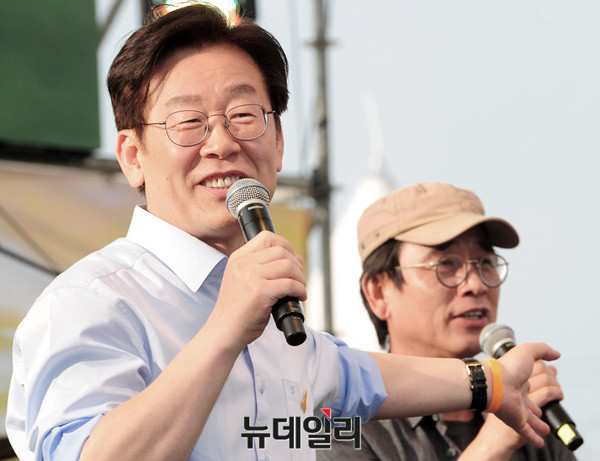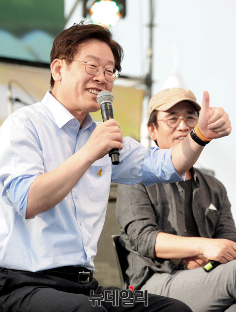 이재명 성남시장이 20일 오전 서울 광화문광장에서 열린 노무현 전 대통령 8주기 추도식 문화제에 참석해 발언하고 있다. 이날 추도제에는 안희정 충남지사, 이재명 서울시장, 유시민 작가 등이 참석했다.