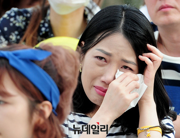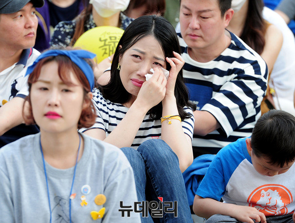 노무현 전 대통령 8주기 추도식에 참석한 한 시민이 20일 오후 서울 광화문광장에서 눈물을 닦고 있다.