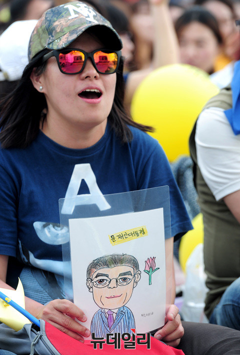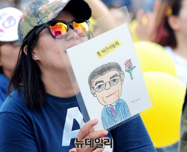 노무현 전 대통령 8주기 추도식에 참석한 한 시민이 20일 오후 서울 광화문광장에서 문재인 대통령 그림을 들고 환호하고 있다.