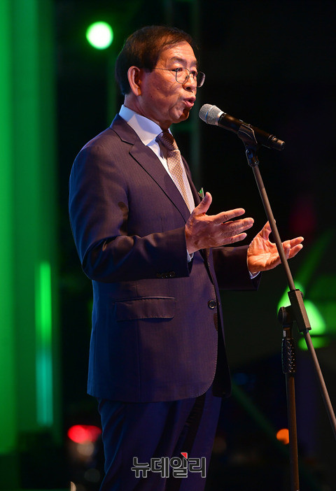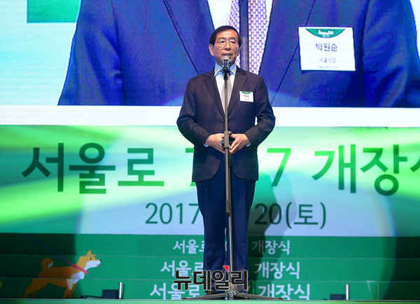박원순 서울시장이 20일 오후 서울 중구 만리동광장에서 열린 '서울로 7017' 개장식에서 인사말을 하고 있다. 이날 오전 개장한 서울로 7017은 과거 45년간 차도로 사용되던 고가도로를 공원형으로 바꾼 보행길이다.