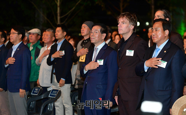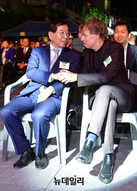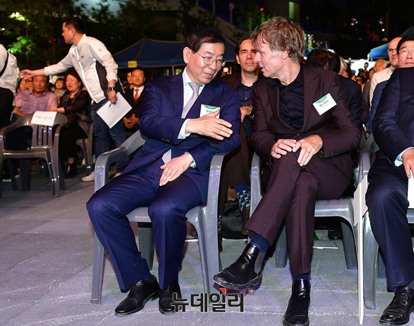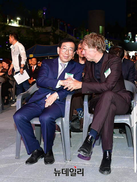 • 박원순 서울시장과 위니마스 서울로7017 설계자가 20일 오후 서울 중구 만리동광장에서 열린 '서울로7017' 개장식에 앞서 대화를 나누고 있다. 서울로7017은 지난 45년 동안 차도로 이용된 서울역 고가를 폐쇄하고, 대대적인 보강 공사를 거쳐 공원으로 재탄생 했다.