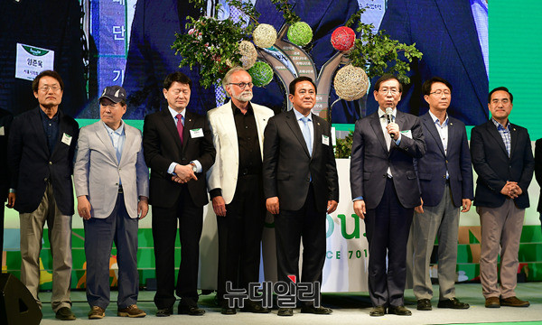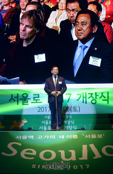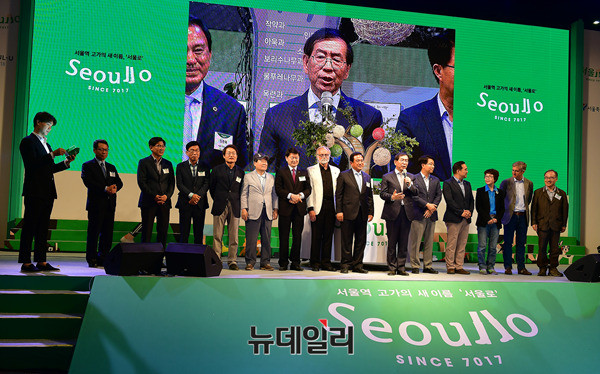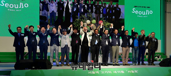박원순 서울시장, 조희연 서울시교육감, 이광구 우리은행장 등 관계자들이 20일 오후 서울 중구 만리동광장에서 열린 '서울로7017' 개장식에서 기념촬영을 하고 있다. 서울로7017은 지난 45년 동안 차도로 이용된 서울역 고가를 폐쇄하고, 대대적인 보강 공사를 거쳐 공원으로 재탄생 했다.