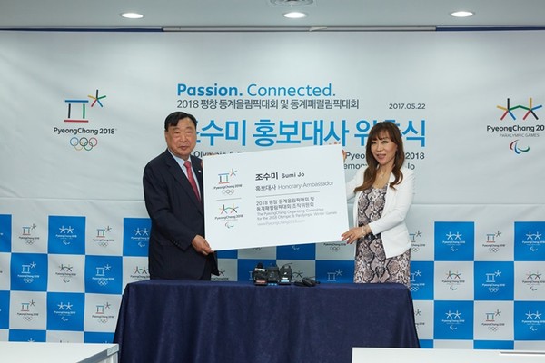'신이 내린 목소리' 소프라노 조수미가 평창동계올림픽을 전 세계에 알린다.2018 평창 동계올림픽대회 및 동계패럴림픽대회 조직워원회(위원장 이희범)는 22일 "세계적인 성악가로 활동 중인 조수미를 이날 오전 서울 프레스센터 외신지원센터에서 평창올림픽 홍보대사로 위촉했다"고 밝혔다.조직위는 이외수, 세종솔로이스츠 등과 함께 조수미의 홍보대사 합류로 더 많은 예술인들의 '문화올림픽 운동' 참여를 기대하고 있다. 조수미는 앞으로 올림픽 홍보를 위해 진행되는 국내외 주요 행사는 물론 온라인 홍보, 광고 등의 사업에 참여하게 된다.조수미와 동계올림픽의 인연은 남다르다. 2006년 '2014 동계올림픽' 유치 염원을 담은 노래 '평창의 꿈'을 발표한데 이어, 2006·2010 평창 동계올림픽 유치위원회 홍보대사로 활동한 바 있다. 2014년 소치동계올림에서는 폐회식 무대에 올라 '아리랑 판타지'를 노래했다.조수미는 "평창올림픽 유치 때부터 함께 해왔기 때문에 굉장히 기쁘고 영광스럽다. 얼마 남지 않은 대회가 세계적인 축제가 되도록 최선을 다하겠다"고 소감을 밝혔다.한편, 조수미는 오는 27일 부산영화의전당 야외무대에서 '봄의 열정' 공연이 예정돼 있다.