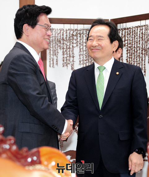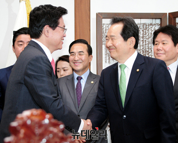 정세균 국회의장이 22일 오전 국회의장실에서 자유한국당 정우택 권한대행 겸 원내대표와 악수를 나누고 있다.