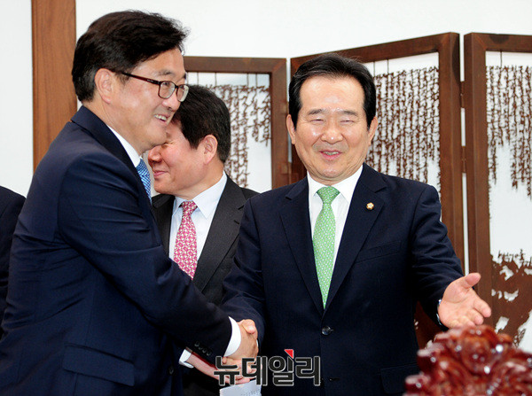정세균 국회의장이 22일 오전 국회의장실에서 더불어민주당 우원식 원내대표와 악수를 나누고 있다.