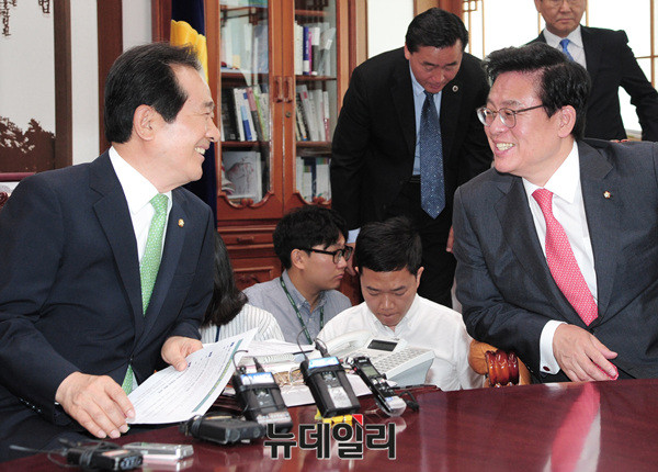 정세균 국회의장이 22일 오전 국회의장실에서 자유한국당 정우택 권한대행 겸 원내대표와 대화를 나누고 있다.