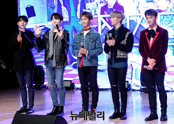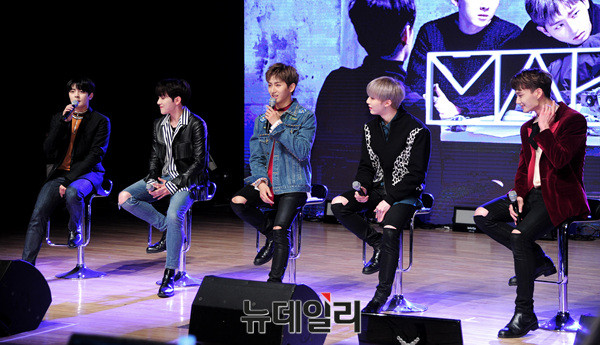 그룹 맵식스(MAP6 : 민혁, 싸인, 썬, 제이빈, 제이준)가 22일 오후 서울 강남구 일지아트홀에서 열린 세 번째 싱글앨범 '모멘텀(MOMENTUM)' 발매 기념 쇼케이스에 참석해 질문에 답하고 있다.
