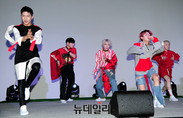 신인 그룹 '에이스(A.C.E : 준, 동훈, 와우, 제이슨, 찬)'가 22일 오후 서울 강남구 KWAVE에서 열린 데뷔 첫 싱글 '선인장(CACTUS)' 발매 기념 쇼케이스에 참석해 신곡을 선보이고 있다.