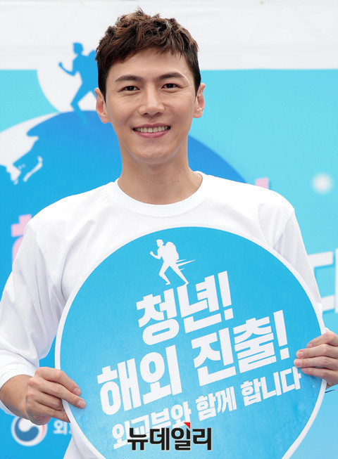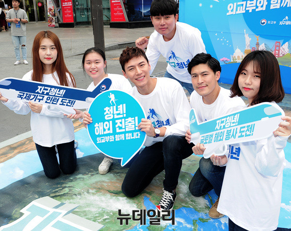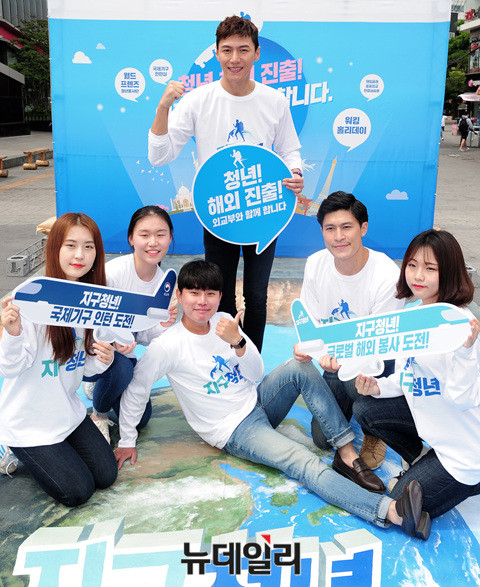 배우 송재희가 23일 오전 서울 서대문구 신촌 스타광장에서 열린 외교부 청년 해외 진출 지원 정책 통합 브랜드 '지구청년' 론칭 행사에 참석해 모델들과 포토타임을 갖고 있다.