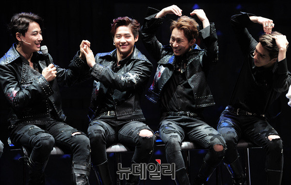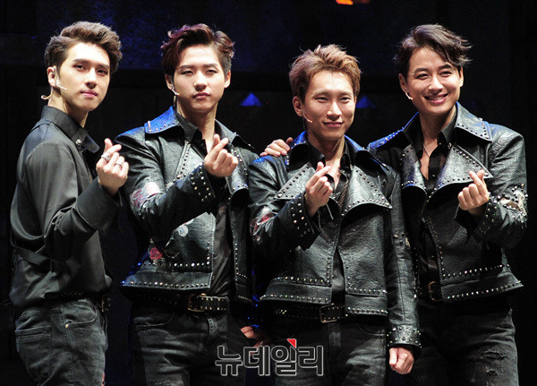 뮤지컬 '햄릿(HAMLET)'에서 햄릿 역을 맡은 배우 이지훈, 신우(B1A4), 서은광(BTOB), 켄(VIXX)이이 23일 오후 서울 구로구 디큐브아트센터에서 열린 프레스콜에서 포토타임을 갖고 있다.
