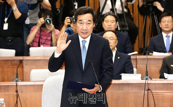 이낙연 국무총리 후보가 24일 오전 국회에서 열린 인사청문회에 참석해 선서를 하고 있다.