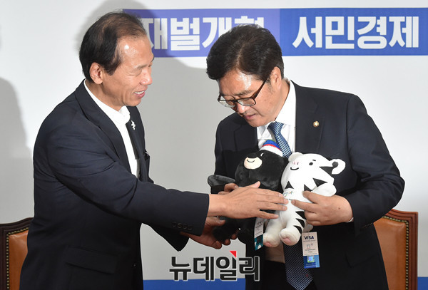 최문순 강원도지사가 24일 오전 국회 더불어민주당 원내대표실을 찾아 우원식 원내대표에게 평창 동계올림픽 마스코트를 선물하고 있다.