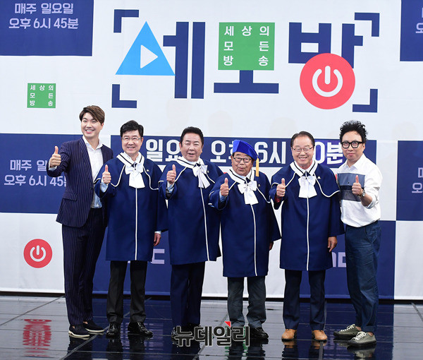 세모방 출연자 박수홍, 임백천, 허참, 송해, 이상벽, 박명수(왼쪽부터)가 24일 오후 서울 마포구 상암MBC 골든마우스홀에서 열린 '세모방(세상의모든방송)' 제작보고회에서 포토타임을 갖고 있다.