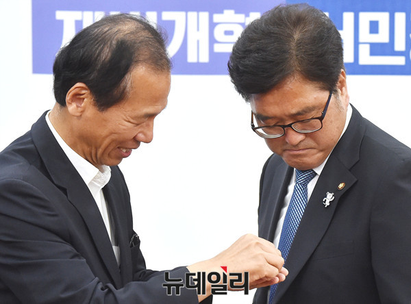 최문순 강원도지사가 24일 오전 국회 더불어민주당을 찾아 우원식 원내대표에게 평창 동계올림픽 지원을 요청하고 있다.