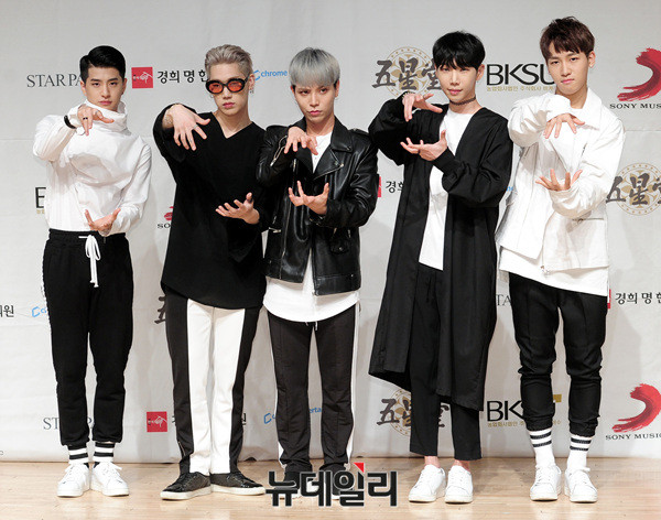 그룹 '가물치'에서 팀명을 바꾼 '비에이(Be.A : 홍규, 영균, 밀리, 아토, 범)'가 25일 오전 서울 강남구 일지아트홀에서 열린 데뷔 첫 싱글 '매지컬리얼리즘(Magical realism)' 발매 기념 쇼케이스에 참석해 포토타임을 갖고 있다.