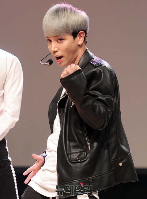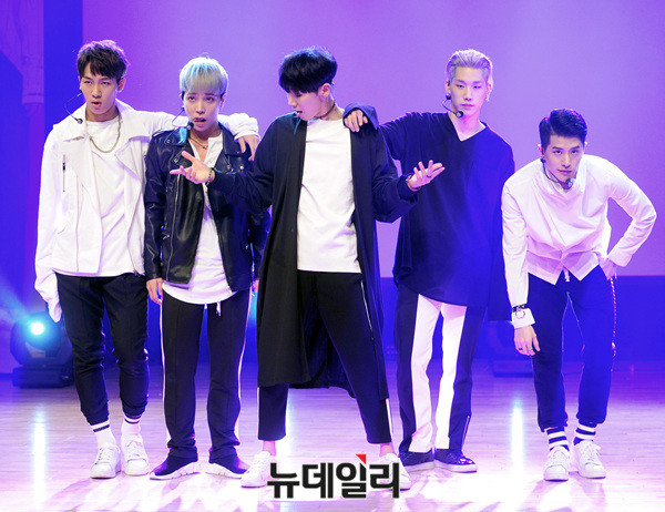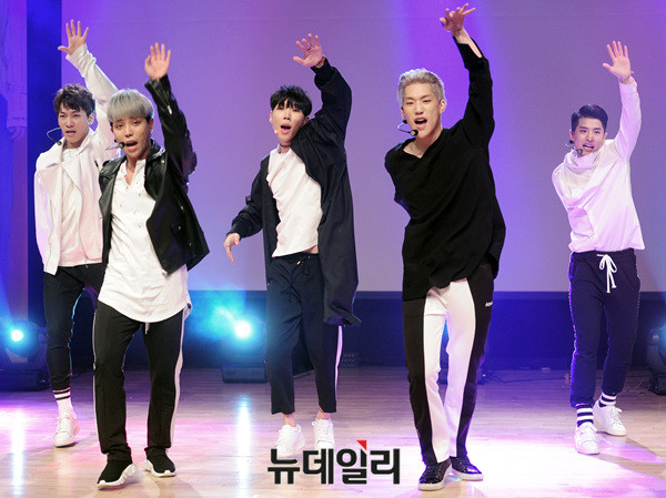 그룹 '가물치'에서 팀명을 바꾼 '비에이(Be.A : 홍규, 영균, 밀리, 아토, 범)'가 25일 오전 서울 강남구 일지아트홀에서 열린 데뷔 첫 싱글 '매지컬리얼리즘(Magical realism)' 발매 기념 쇼케이스에 참석해 데뷔 무대를 선보이고 있다.