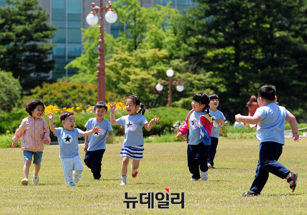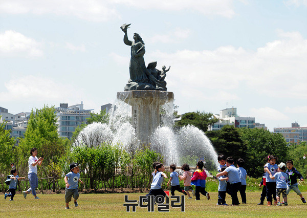 아이들이 26일 오후 서울 국회앞 분수대에서 소풍을 즐기고 있다. 오늘(26일) 기사청은 전국이 맑고 선선한 가운데 주말인 내일과 일요일에는 다시 여름 더위가 찾아올 전망이라고 밝혔다.