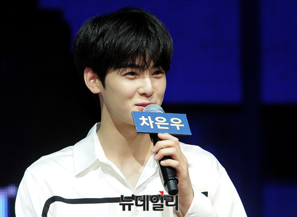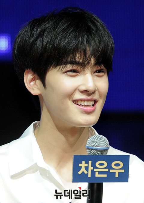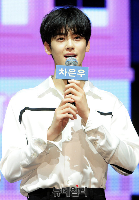 그룹 아스트로(ASTRO : 차은우, 문빈, MJ, 진진, 라키, 윤산하) 차은우가 26일 오후 서울 강남구 SAC아트센터에서 열린 네 번째 미니앨범 '드림파트1(Dream Part.01)' 발매 기념 쇼케이스에 참석해인터뷰 중 자신의 외모를 97점이라고 말하고 있다.