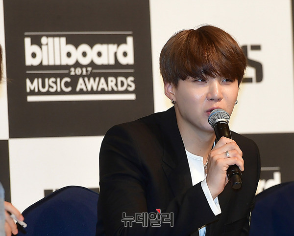 방탄소년단 슈가가 29일 오전 서울 중구 롯데호텔서울에서 2017빌보드뮤직어워드(2017 BBMAs) 톱 소셜 아티스트 부문 수상 기념 기자간담회에 참석해 수상 소감을 밝히고 있다.