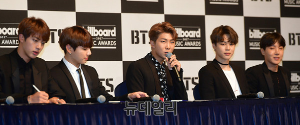 방탄소년단 랩몬스터가 29일 오전 서울 중구 롯데호텔서울에서 2017빌보드뮤직어워드(2017 BBMAs) 톱 소셜 아티스트 부문 수상 기념 기자간담회에 참석해 수상 소감을 밝히고 있다.