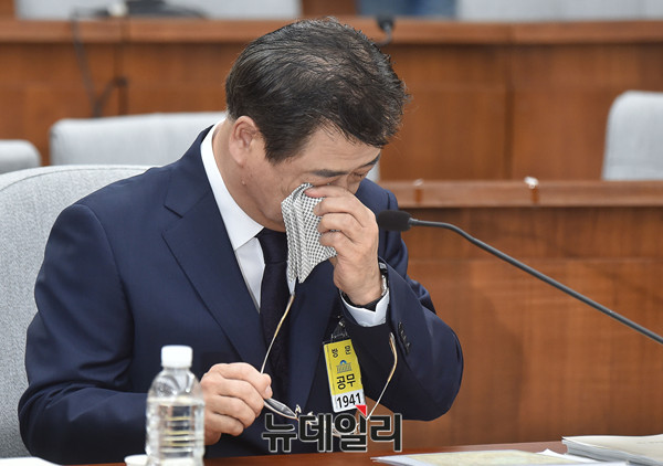 서훈 국가정보원장 후보자가 29일 오전 국회에서 열린 인사청문회에 출석해 손수건으로 눈을 만지고 있다.
