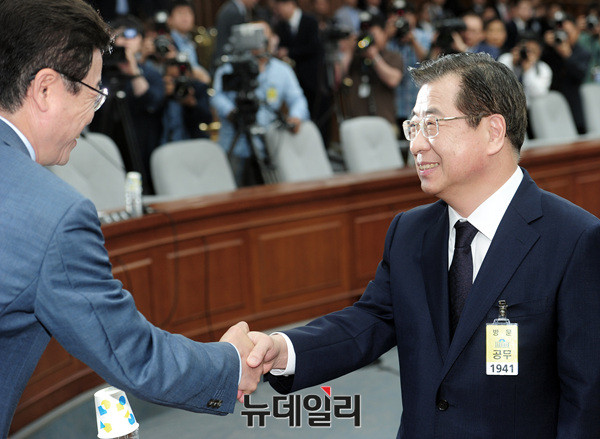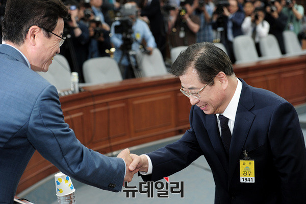 서훈 국가정보원장 후보자가 29일 오전 국회에서 열린 인사청문회에 출석해 이철우 위원장과 악수를 나누고 있다.