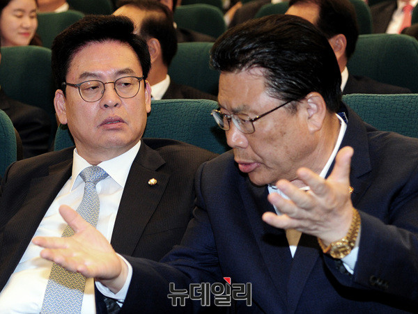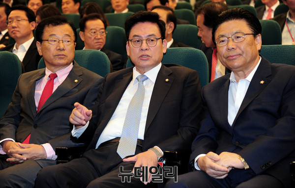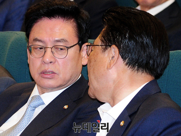 정우택 자유한국당 대표 권한대행 겸 원내대표와 이현재 정책위의장, 박맹우 사무총장 등이 30일 오전 국회도서관에서 열린 '제19대 대선 평가와 자유한국당이 나아가야할 길' 대토론회에서 대화를 나누고 있다.