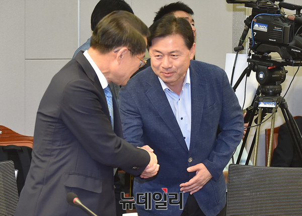 해양수산부장관으로 지명된 더불어민주당 김영춘 의원이 30일 오후 국회 의원회관에서 열린 '안전, 건강의 국가 먹거리 시스템 어떻게 만들까' 세미나에 참석해 김재수 농림축산식품부 장관과 대화를 나누고 있다.