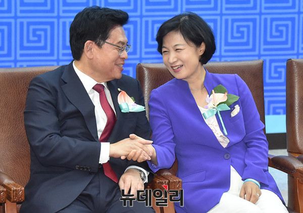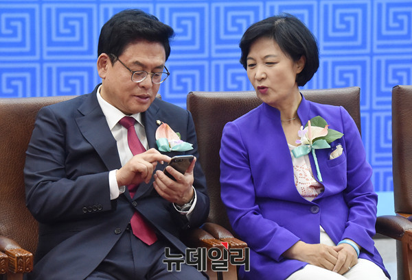 추미애 더불어민주당 대표와 정우택 자유한국당 대표 권한대행 겸 원내대표가 31일 오전 국회에서 열린 제69주년 국회개원기념식에서 대화를 나누고 있다.