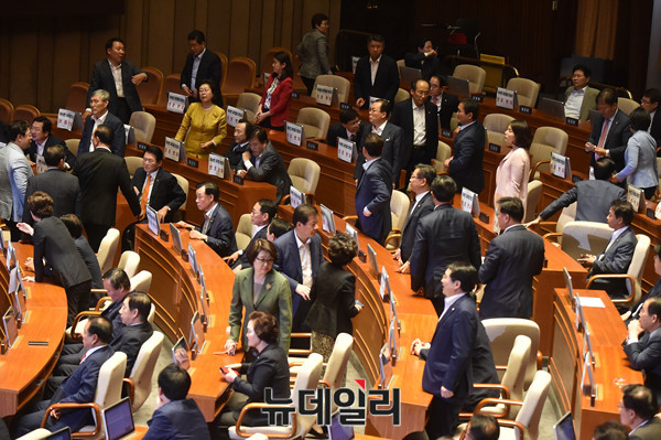 자유한국당 의원들이 31일 오후 국회에서 열린 이낙연 국무총리 후보자의 인준안 표결을 위한 본회의 중 항의에 의미로 퇴장하고 있다.