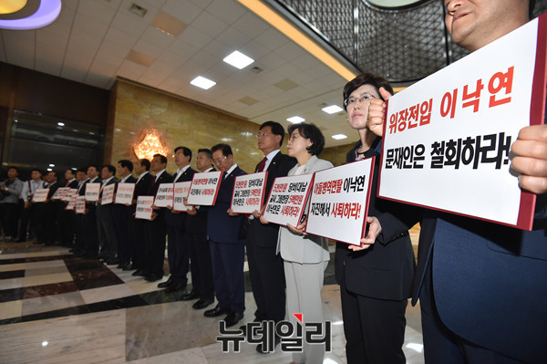 자유한국당 소속의원들이 31일 오후 국회 로텐더홀에서 이낙연 국무총리 후보자 인준반대 피켓시위를 하고 있다.