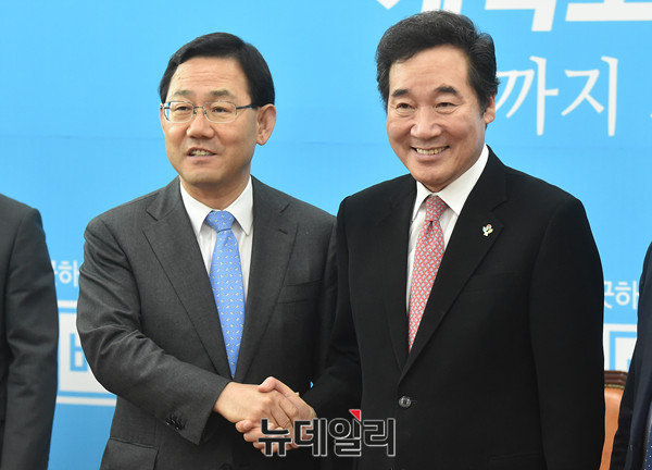 주호영 바른정당 원내대표가 1일 오전 국회 바른정당 원내대표실을 예방한 이낙연 신임 국무총리와 악수를 하고 있다.