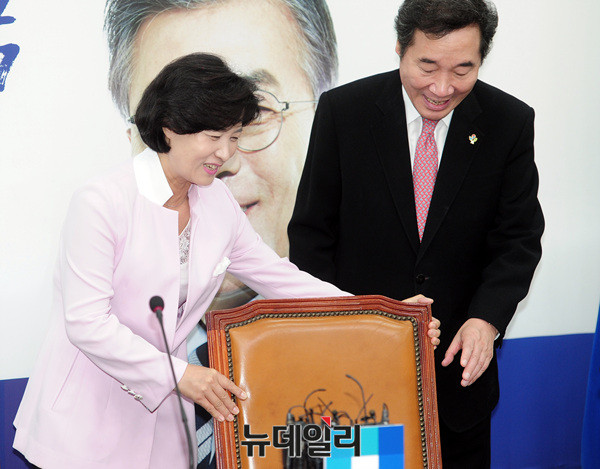 추미애 더불어민주당 대표가 1일 오전 국회 당대표실에서 이낙연 국무총리에게 의자를 빼주고 있다.