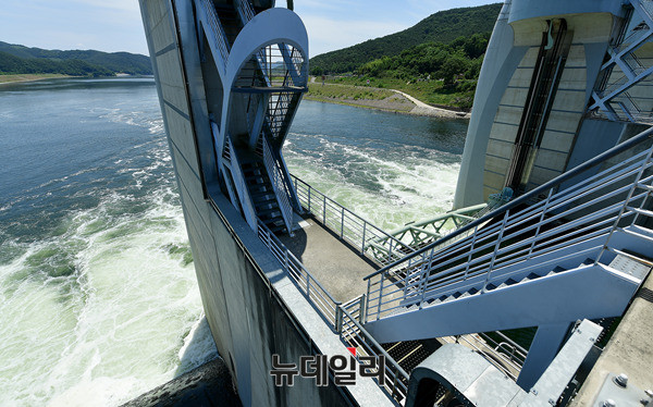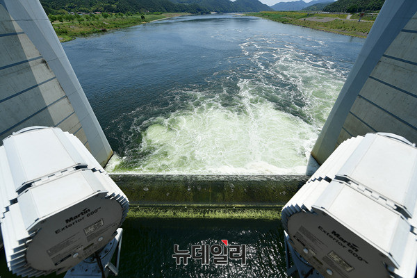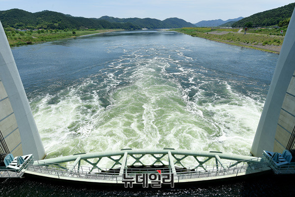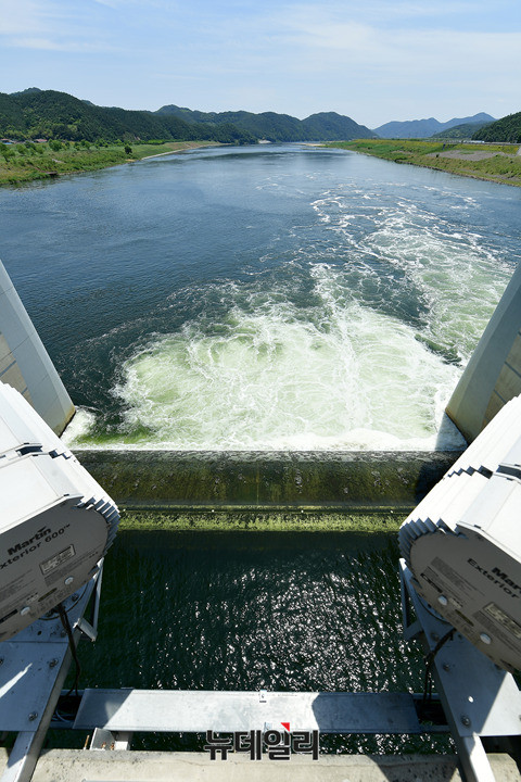 경남 합천군과 창녕군에 인접한 낙동강 합천창녕보가 2일 오후 낙동강으로 물을 흘려 보내고 있다. 수문은 지난 1일 오후 2시부터 개방됐다. 개방수위는 10.5m에서 9.5m다.