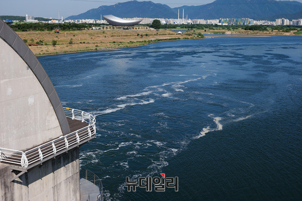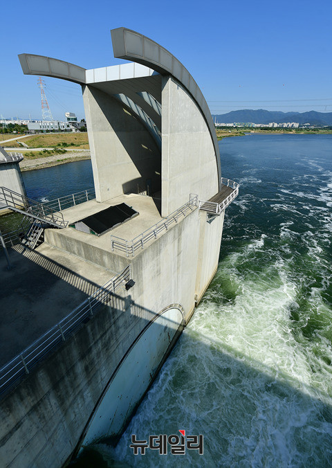 대구 달성군과 경북 고령군에 인접한 낙동강 강정고령보가 2일 오후 낙동강으로 물을 흘려 보내고 있다. 수문은 지난 1일 오후 2시부터 개방됐다. 개방수위는 14m에서 13.5m로 낮춘다.