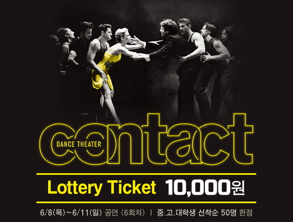 '컨택트' 로터리 티켓은 전 좌석을 1만원에 판매하며, 개막일인 8일부터 11일까지 총 6회차 공연 기간 동안 학생 관객에 한해 구매할 수 있다. 해당 티켓은 공연 시작 1시간 전부터 선착순 50명에게 판매된다.