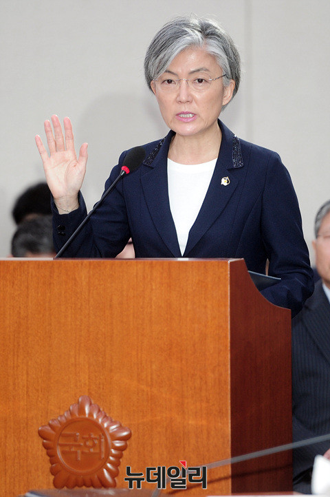 강경화 외교부장관 후보자가 7일 오전 국회 외교통일위원회에서 열린 인사청문회에 출석해 선서를 하고 있다. 강 후보자는 딸의 이중국적, 위장전입 문제와 박사학위 논문 표절 혐의를 받고 있다.