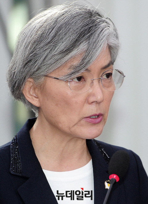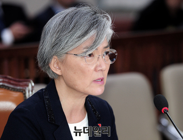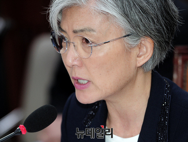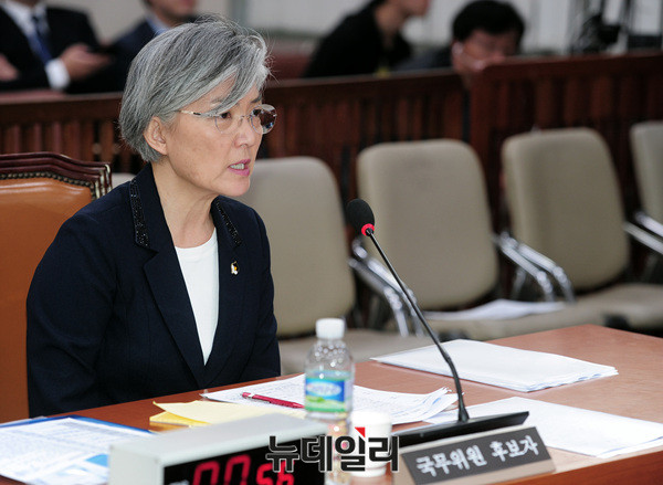 강경화 외교부장관 후보자가 7일 오전 국회 외교통일위원회에서 열린 인사청문회에 출석해 질문에 답하고 있다. 강 후보자는 딸의 이중국적, 위장전입 문제와 박사학위 논문 표절 혐의를 받고 있다.