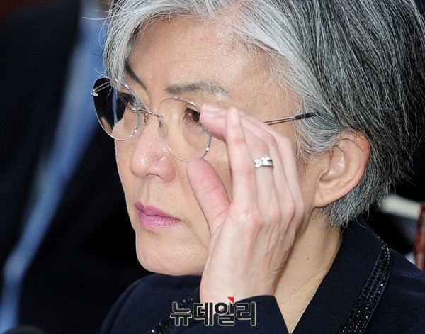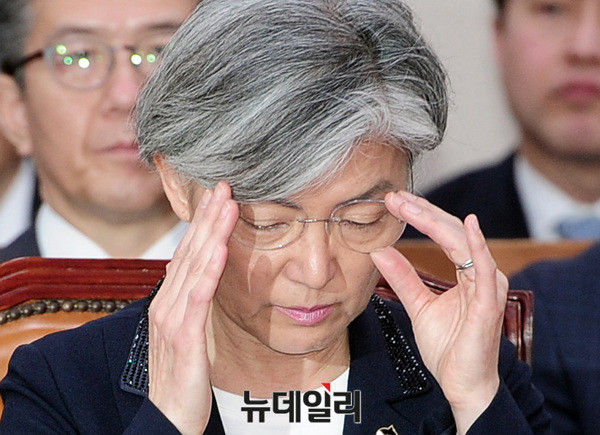 강경화 외교부장관 후보자가 7일 오전 국회 외교통일위원회에서 열린 인사청문회에 출석해 안경을 만지고 있다. 강 후보자는 딸의 이중국적, 위장전입 문제와 박사학위 논문 표절 혐의를 받고 있다.