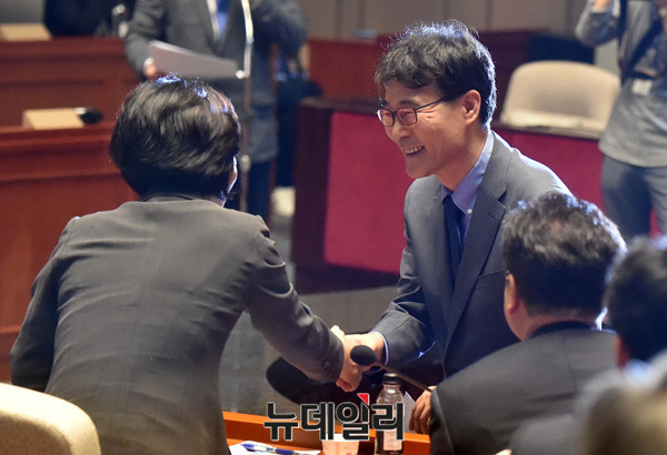 장하성 대통령비서실 정책실장이 8일 오전 국회에서 열린 더불어민주당 의원총회에 참석해 발언을 마치고 추미애 대표 등 지도부와 인사를 나누고 있다.