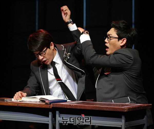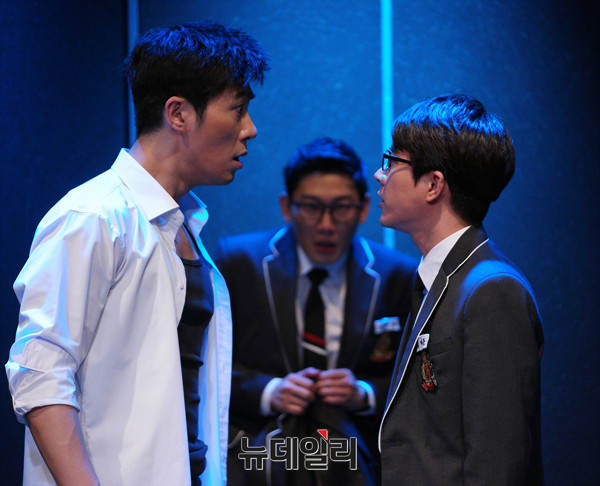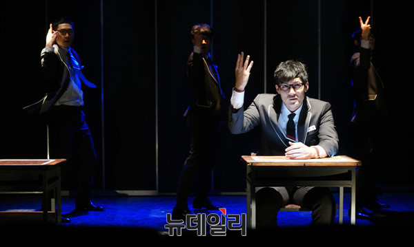 연극 '모범생들' 출연 배우들이 8일 오후 서울 종로구 드림아트센터에서 열린 '모범생들' 프레스콜에 참석해 하이라이트 장면을 시연하고 있다.