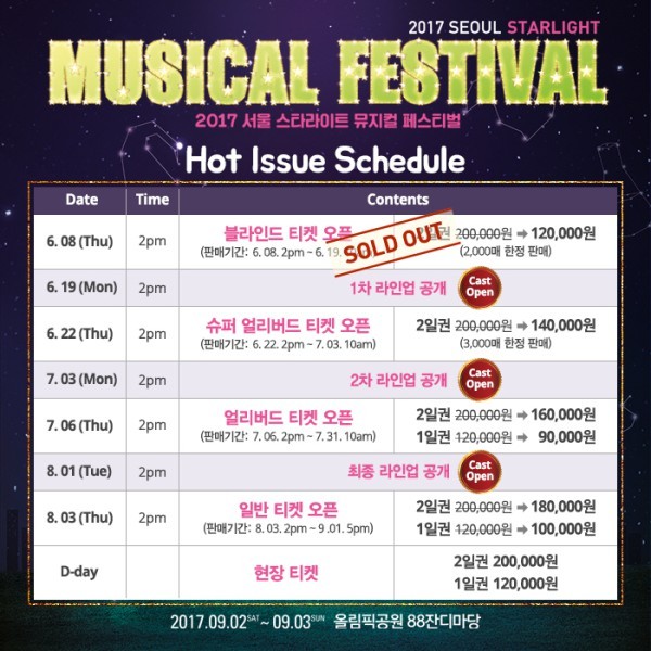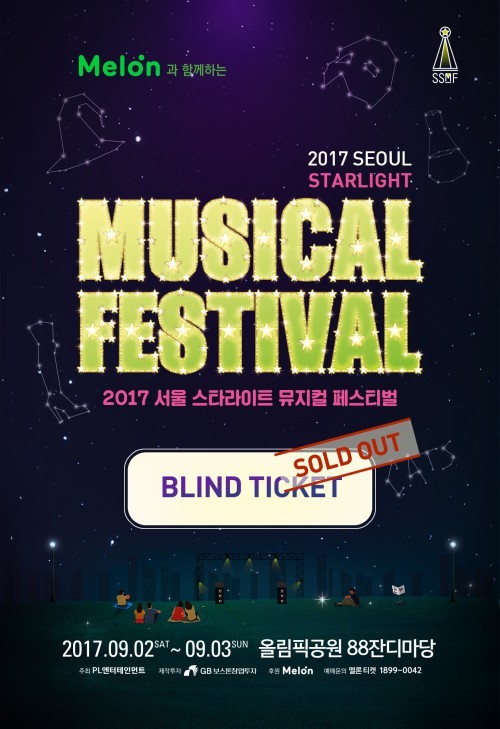 국내 최초 야외 뮤지컬 축제 '2017 서울 스타라이트 뮤지컬 페스티벌'의 블라인드 티켓이 전량 매진됐다.주최사 PL엔터테인먼트는 "8일 오후 2시 멜론 티켓에서 단독 오픈과 동시에 3분 만에 2천장 모두 매진됐다"며 "관객들의 성원과 기대에 보답하기 위해 페스티벌 준비에 최선을 다하겠다"고 밝혔다.'2017 서울 스타라이트 뮤지컬 페스티벌'(구 자라섬뮤지컬페스티벌)은 올해도 관객들과 뮤지컬인들 모두가 만족할 수 있는 풍성하고 다채로운 프로그램, 쾌적하고 편안하게 즐길 수 있는 축제로 거듭날 준비를 하고 있다.블라인드 티켓 오픈을 시작으로 오는 19일 1차 라인업 공개, 22일 슈퍼 얼리버드 티켓 오픈, 7월 3일 2차 라인업 공개, 6일 얼리버드 티켓 오픈, 8월 1일 최종 라인업 공개, 8월 3일 일반 티켓을 오픈할 예정이다.가을밤 아래 뮤지컬 배우들과 노래로 어우러지는 특별한 무대를 경험을 할 수 있는 '2017 서울 스타라이트 뮤지컬 페스티벌'은 9월 2일과 3일 양일간 서울 올림픽공원 88잔디마당에서 개최된다. 문의 1899-0042.