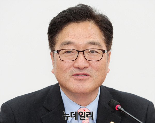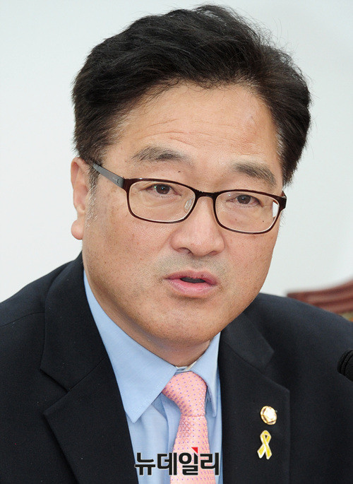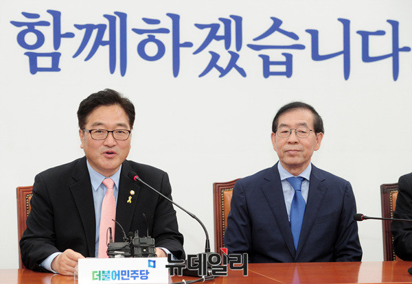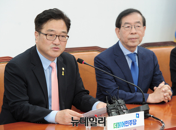 우원식 더불어민주당 원내대표가 9일 오전 국회 원내대표회의실에서 박원순 서울시장을 만나 발언하고 있다.