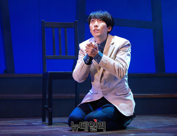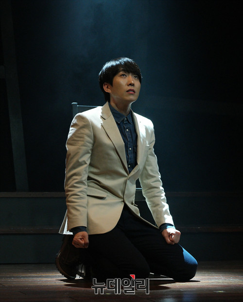 배우 김재범이 9일 오후 서울 종로구 대학로TOM(티오엠)에서 열린 뮤지컬 '인터뷰' 프레스콜에 참석해 하이라이트 장면을 시연하고 있다.