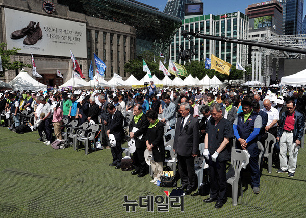 제26회 민족민주열사·희생자 범국민추모제가 열린 10일 오후 서울광장에서 참가자들이 국민의례가 아닌 민중의례를 하고 있다.