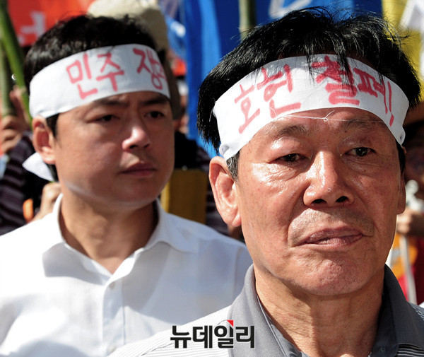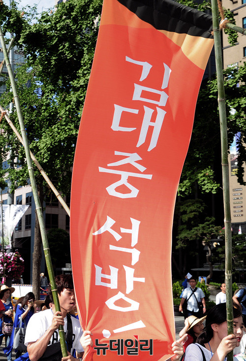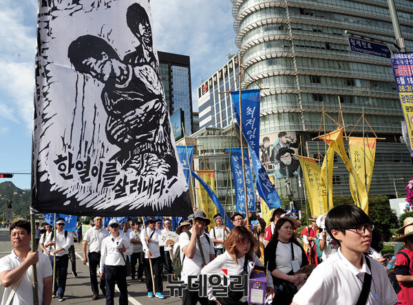 6.10 민주항쟁 30주년 민주시민대동제에 참석한 시민들이 10일 오후 서울 세종대로 일대에서 서울광장 방향으로 행진하고 있다. 이날 참가자들은 '호헌철폐', '독재타도' 등의 띠를 두르고 구호를 외쳤다.