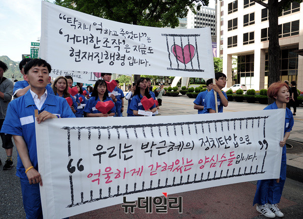 6.10 민주항쟁 30주년 민주시민대동제에 참석한 시민이 10일 오후 서울 세종대로 일대에서 "한상균 민주노총위원장, 이석기 전 통합진보당 국회의원을 석방하라"는 피켓을 들고 행진하고 있다. 이날 참가자들은 '호헌철폐', '독재타도' 등의 띠를 두르고 구호를 외쳤다.