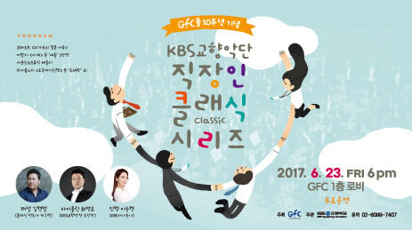 KBS교향악단이 '직장인 클래식 시리즈'를 새롭게 시작한다.KBS교향악단은 국내 최대규모의 오피스빌딩인 강남파이낸스센터(GFC)에서 '직장인 클래식 시리즈'를 창설, 오는 23일 1층 로비에서 처음 선보인다.강남파이낸스센터 안에는 삼정KPMG, BAT코리아, 이베이코리아, 디아지오, 씨티은행, 한국로렉스, 삼성증권등 100여개가 넘는 국내굴지의 기업과 외국인기업들이 포진돼 있다.'내가 사랑하는 클래식 코너'에서는 회사 임직원의 좋아하는 클래식을 소개하고, KBS교향악단이 연주하는 특별한 기회를 갖는다. 악기연주에 재능 있는 각 회사 직장인들을 협연자로 초청해 함께 공연할 계획도 있다.