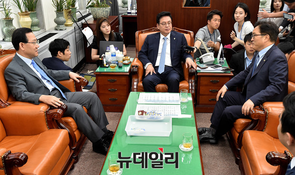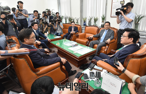 더불어민주당 우원식 원내대표, 바른정당 주호영 당대표 권한대행 겸 원내대표가 12일 오전 국회 자유한국당 정우택 대표권한대행 겸 원내대표를 찾아 국회의장 여야 4당 원내대표 회동에 참석할 것 을 종용하고 있다.