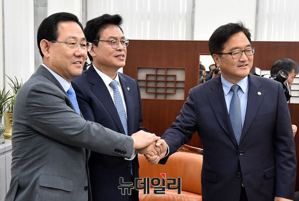 더불어민주당 우원식 원내대표, 바른정당 주호영 당대표 권한대행 겸 원내대표가 12일 오전 국회 자유한국당 정우택 대표권한대행 겸 원내대표를 찾아 국회의장 여야 4당 원내대표 회동에 참석할 것 을 종용한 후 포토타임을 갖고 있다.
